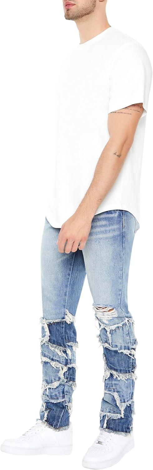 Forever 21 Men’s Frayed Patchwork Slim-fit Jeans(Medium Denim)