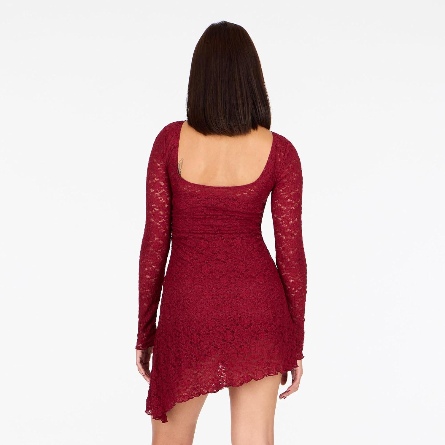Forever 21 Womens Long Sleeve Lace Mini Dress Lace Overlay Fitted Party Outfit(Burgundy)