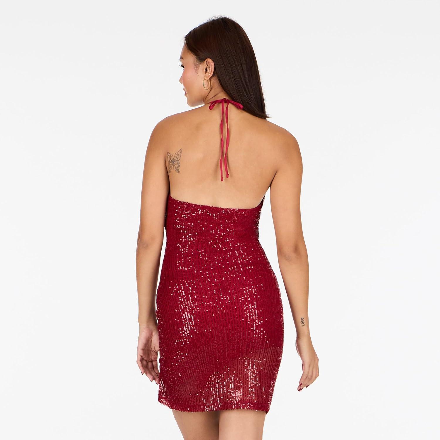 Forever 21 Womens Mini Dress W/Sequins, Pull on and Halter Top(Red)