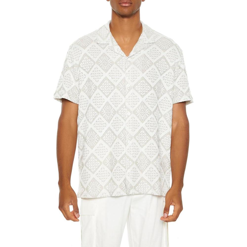 A lace shirt featuring an allover diamond pattern, Cuban collar, button-front closures, and short sleeves.