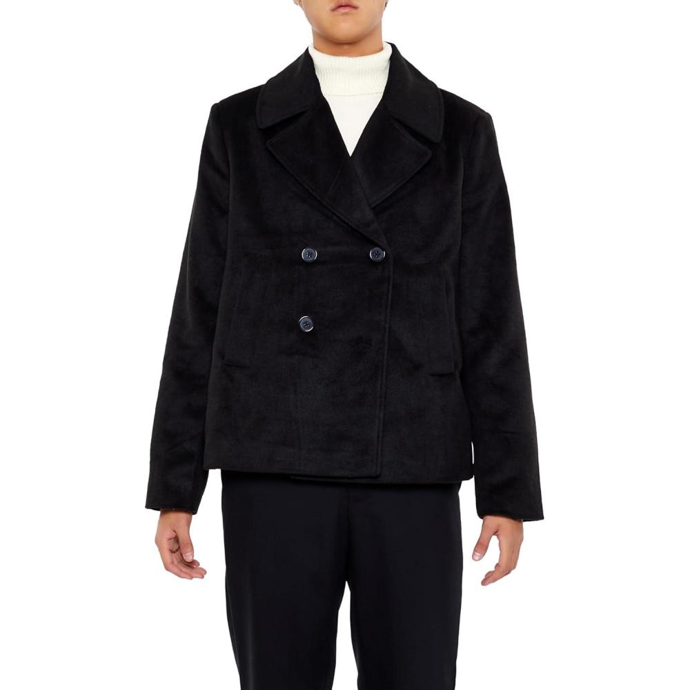 A woven brushed coat featuring notched lapels, a double-breasted construction, slanted front pockets, and long sleeves.