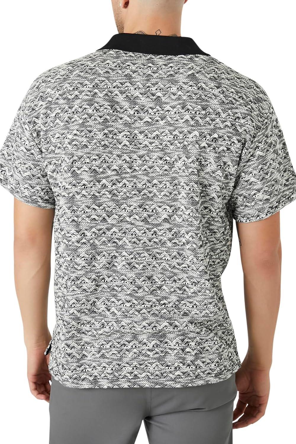 A textured knit polo shirt featuring an allover ornate pattern, contrasting basic collar and split neck, and short sleeves.
