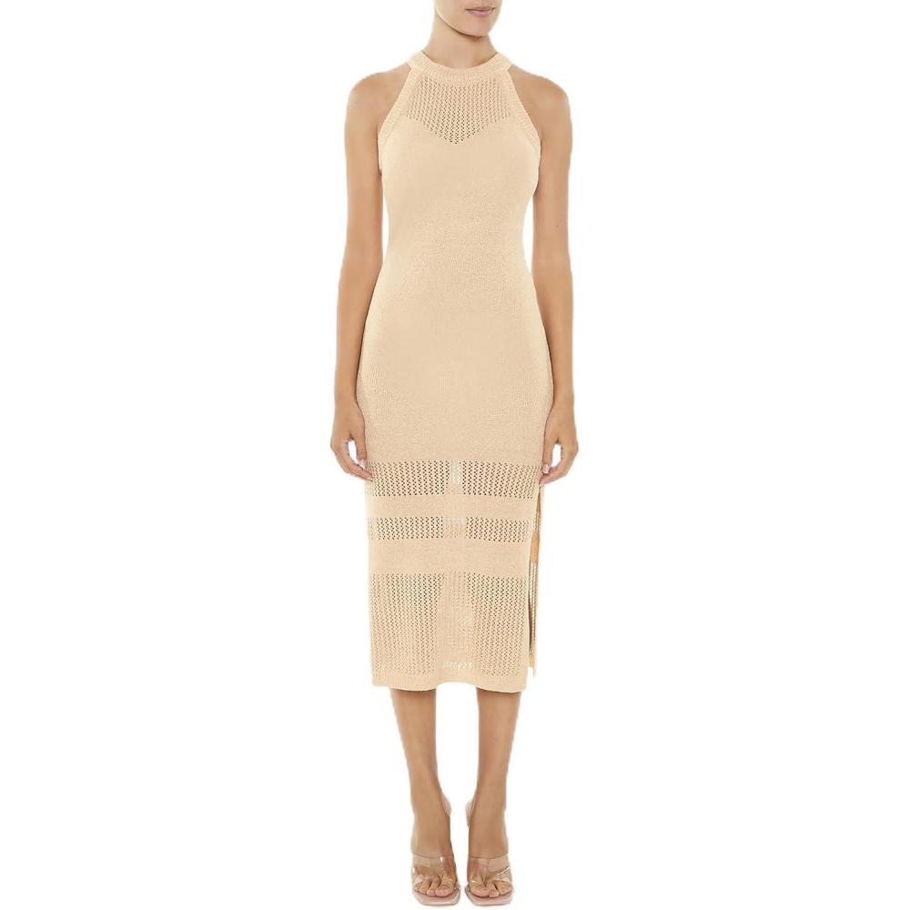 A crochet sweater dress featuring a midi length, ribbed trim, a round neckline, sleeveless cut, leg side slit, and bodycon silhouette.