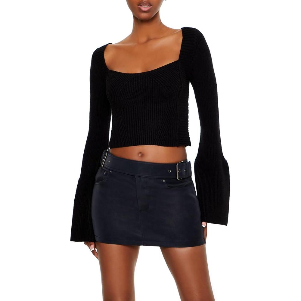 A ribbed knit sweater featuring a square-cut neckline, long bell sleeves, and a cropped hem.