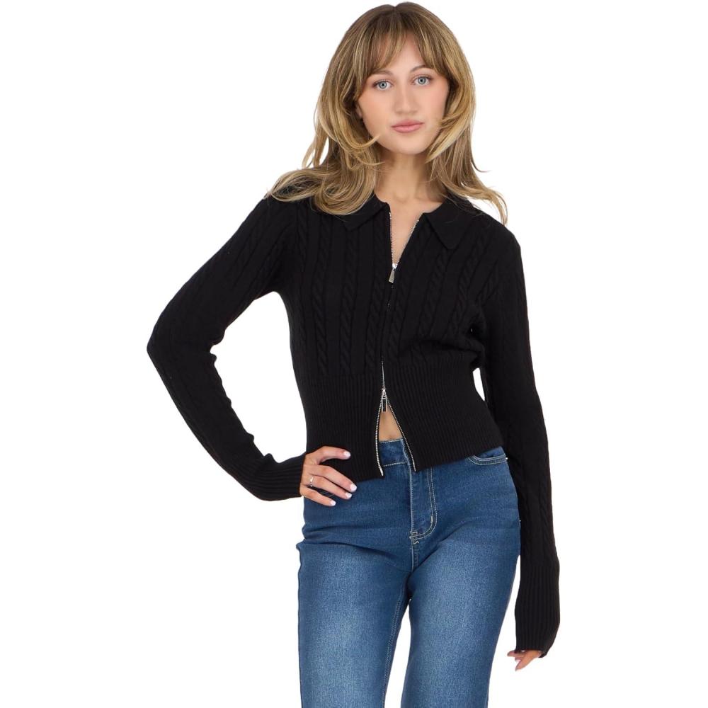 Forever 21 Womens Double Zip Cable Knit Sweater with Collar(Black)