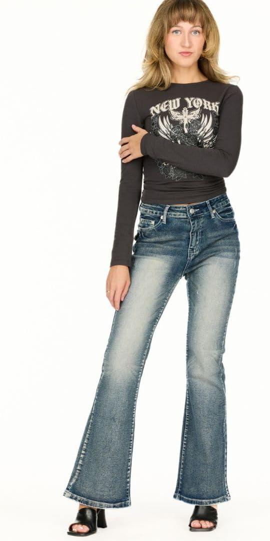 Forever 21 Women’s Flare Denim High-Rise Slim Fit Stretch Jeans-Retro Y2k Style(Dark Blue)