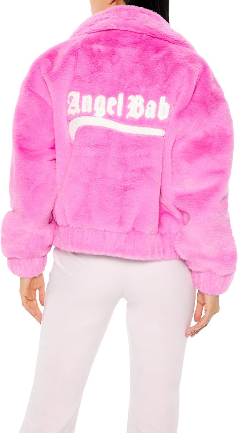 A plush bomber jacket featuring elasticized trim, a basic collar, zip-up front closure, faux shearling chest letter “A” and back “Angel Baby” text, dropped long sleeves, and slanted front pockets.