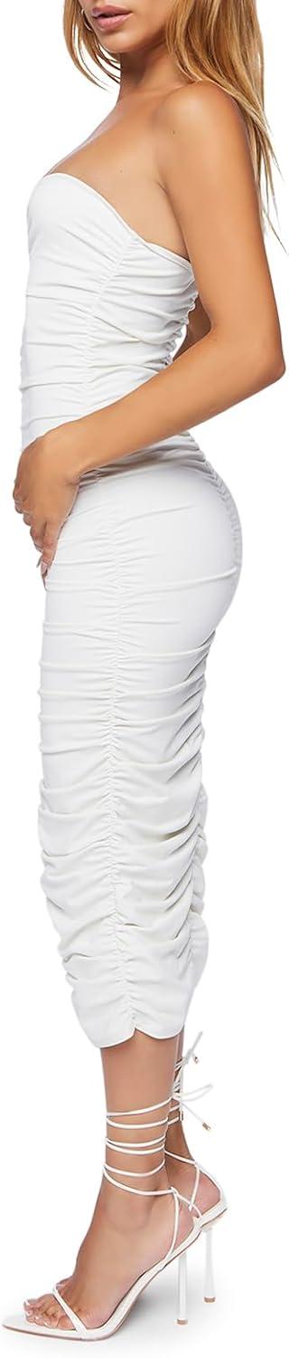 A knit midi dress featuring an allover ruched construction, a strapless sweetheart neckline, straight-cut back, and a bodycon silhouette.