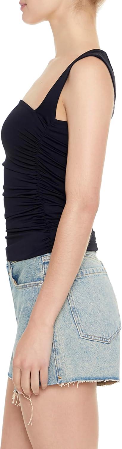 A knit top featuring a ruched construction, square neckline, shoulder straps, and a fitted silhouette.